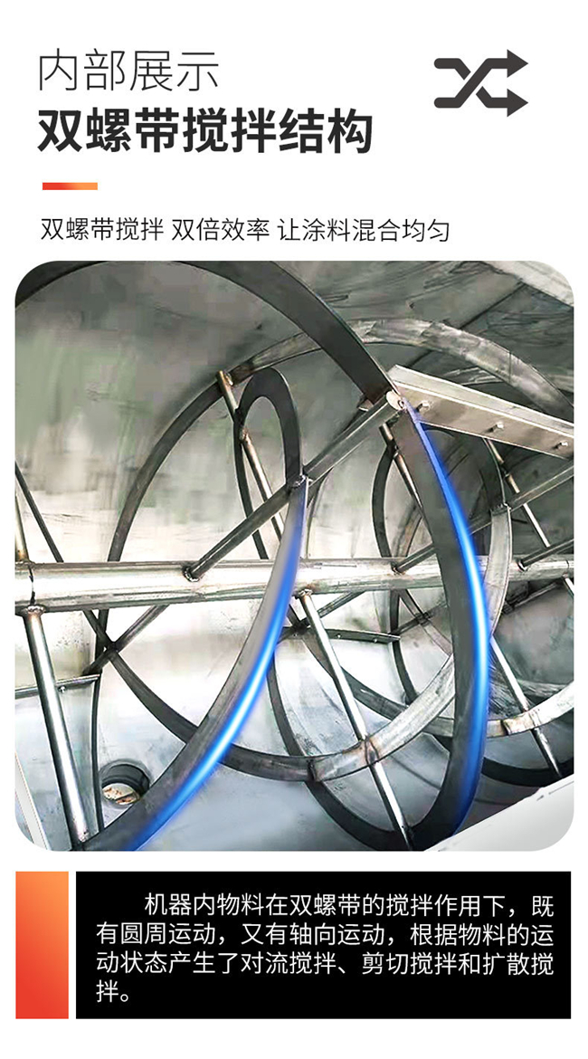臥式螺帶混合機傳動主軸上布置雙層螺旋葉片,內(nèi)部螺旋將物料向外側輸送,外部螺旋將物料向內(nèi)部聚集。物料在雙層螺旋帶的對流運動下,形成一個低動力高效的混合環(huán)境。安裝于攪拌軸上的內(nèi)外徑螺旋帶動桶體內(nèi)物料,使攪拌器在桶體內(nèi)最大范圍翻動物料。攪拌裝置工作時內(nèi)螺旋帶動靠近軸心處物料做軸心旋轉(zhuǎn),軸向由內(nèi)至兩側推動,外螺旋帶動靠近桶壁物料做軸心旋轉(zhuǎn),軸向由兩側至內(nèi)推動,本混合物料能夠在較短時間內(nèi)均勻混合。